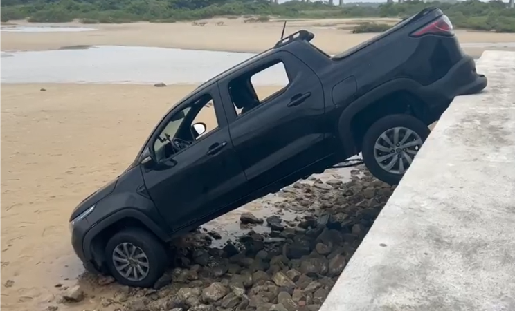 Um carro amanheceu "pendurado" na passarela do Forte dos Reis Magos, em Natal, na manhã desta sexta-feira (9). Segundo a Polícia Militar, o condutor ainda não foi localizado.