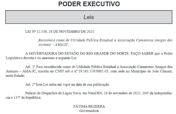 A governadora do Rio Grande do Norte sancionou, nesta sexta-feira (28), a Lei nº 12.538/2025, que reconhece oficialmente a Associação Camarense Amigos dos Animais (AMA/JC) como entidade de Utilidade Pública Estadual.
