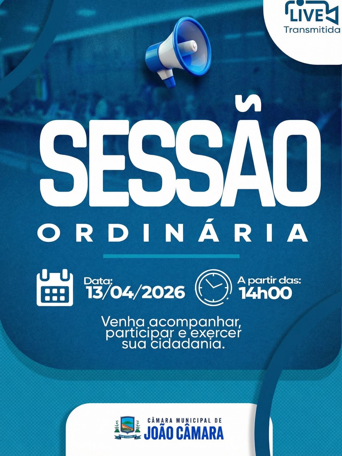 Nesta segunda-feira, (13/04/2026), as 14H acontece mais uma sessão ordinária no plenário da Câmara Municipal de João Câmara, com a participação dos vereadores para debater e deliberar sobre pautas de interesse da população.