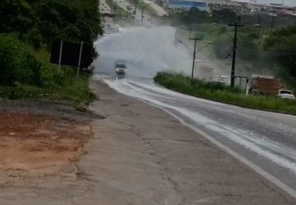 Impressionante: tubulação estoura e inunda trecho da BR-406 na Grande Natal; assista